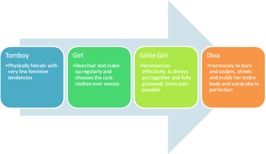 As a result of these revelations, I have come up with a spectrum of girliness, and my new goal is to just move further down the scale knowing that I am NEVER going to reach the pinnacle.