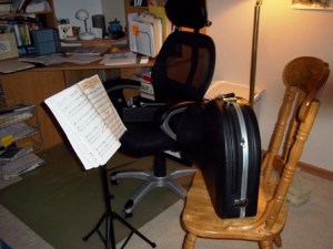 My first day with “music teaching” on my mind, I went in with Middle Sprout to listen to her practice. I realized that when she was in our front room, she could hear all the noise and music of her siblings in the basement. It was not conducive to her learning. So we moved. I helped her to set up her stand, chair, and instrument in the writing space of my room. An appropriate space for creativity, I thought.